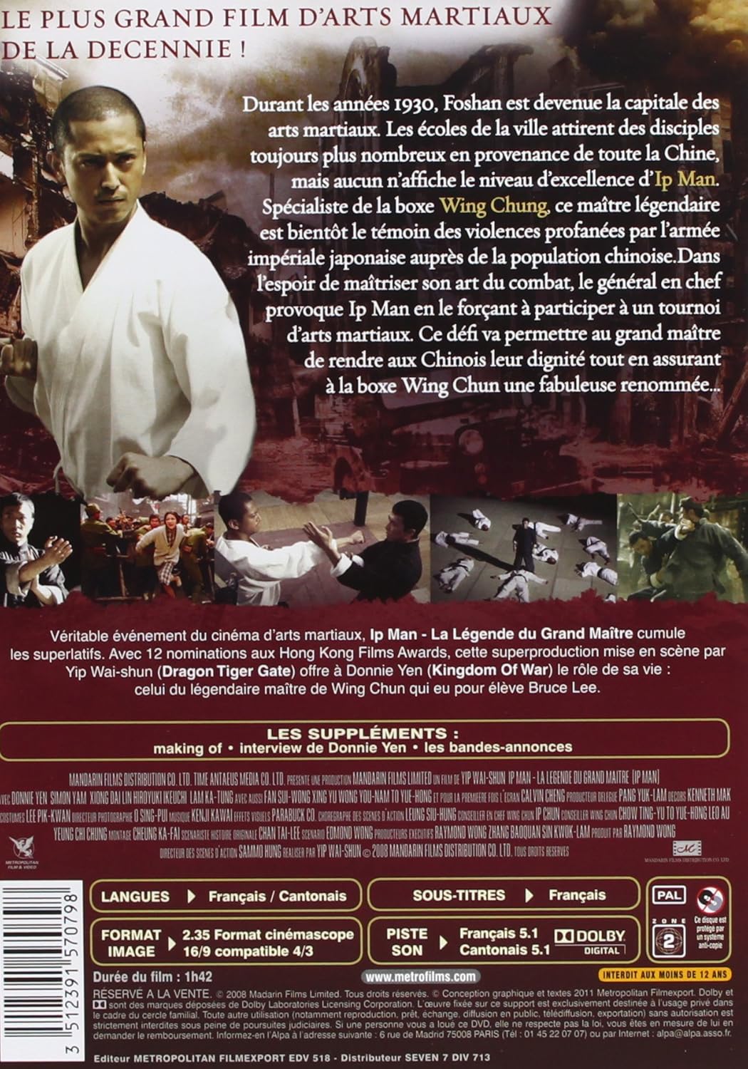 From acclaimed director/writer Wong Kar Wai comes an epic tale inspired by the life of the warrior hero who taught Bruce Lee Asian superstar Tony Leung (In The Mood For Love) portrays legendary kung fu master Ip Man, who survived the turmoil of 1930s China to change the world of martial arts forever. Film biographique sur la vie de Ip Man, un maître de KungFu spécialisé dans le style Wing Chun et qui fut le mâitre de Bruce Lee Dans les années 30, Ip Man vit à Foshan dans le sud de la Chine, lors de l'occupation japonaise. Film biographique sur la vie de Ip Man, un maître de KungFu spécialisé dans le style Wing Chun et qui fut le mâitre de Bruce Lee Dans les années 30, Ip Man vit à Foshan dans le sud de la Chine, lors de l'occupation japonaise.