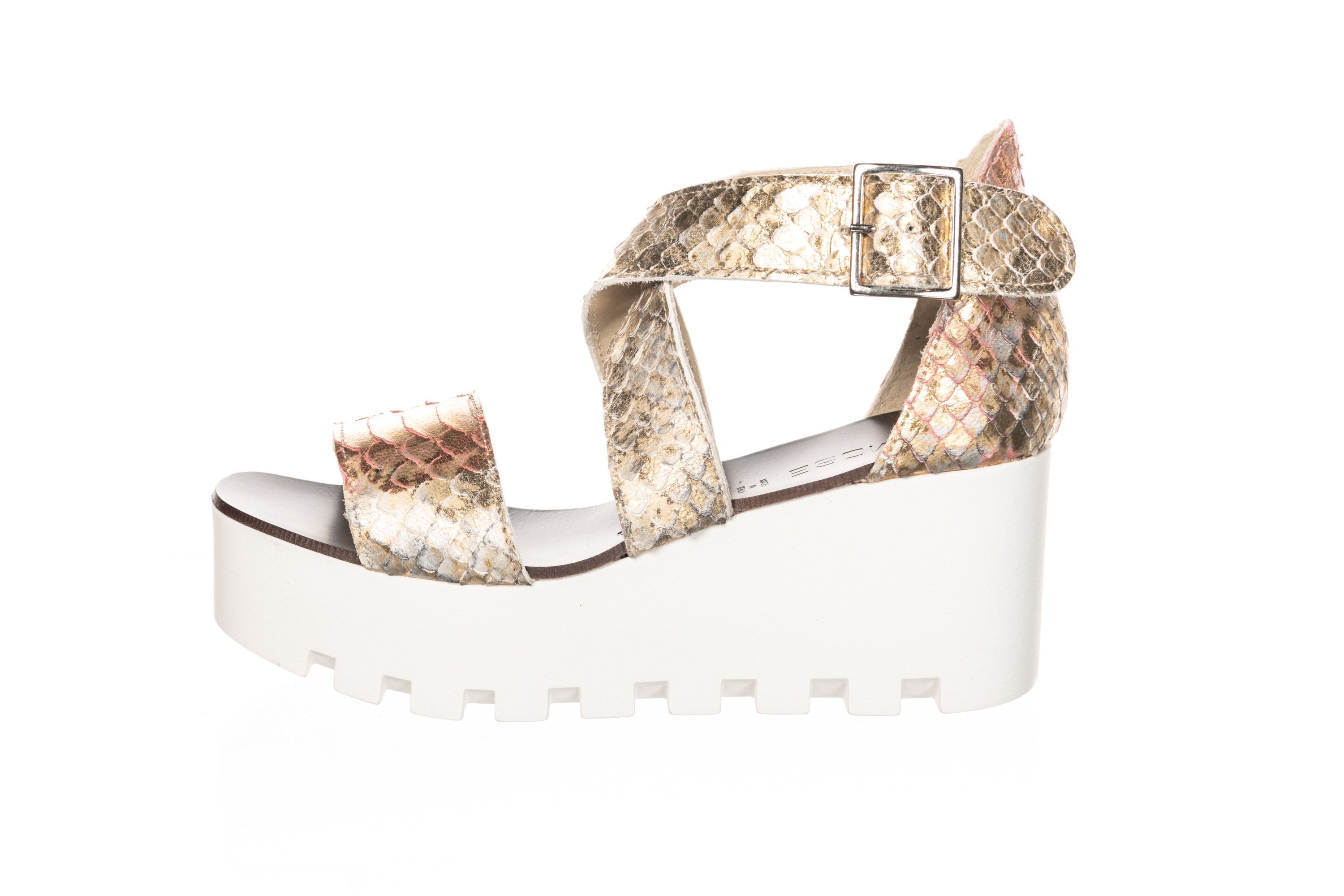 Sandale Lamine Python Or Rose Compensee A Plateforme Semelle Crantee