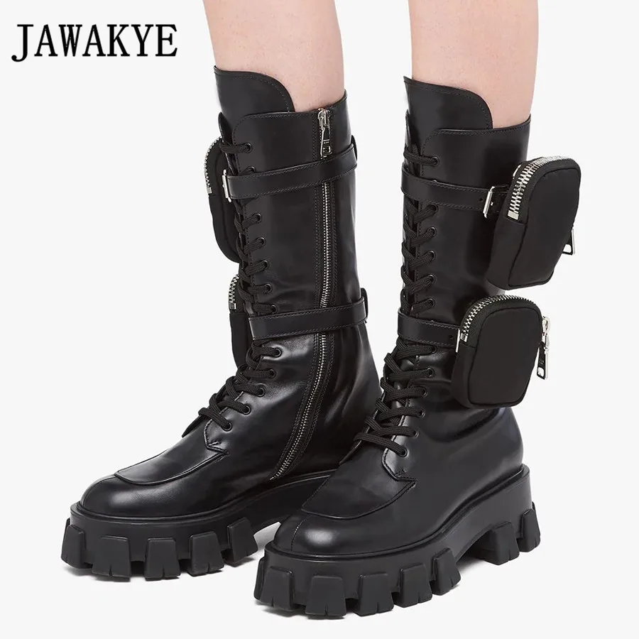 Nouveau Fond Epais Monolithe Bottes A Talons Hauts Femmes A Lacets Fermeture Eclair Avec Poche Bottes Longues Noir Chaussures D Hiver Femme Bottes De Moto Aliexpress