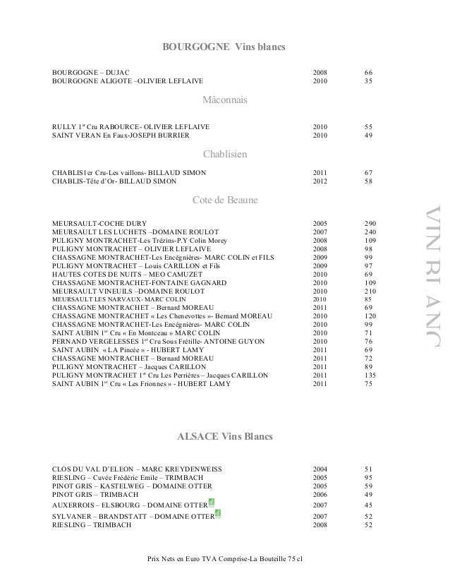 Carte Bourgogne et plan Bourgogne Le guide du routard Bourgogne en ligne vous propose toutes les informations pratiques, culturelles, carte Bourgogne, plan Bourgogne, photos Bourgogne, météo. La Côte de Beaune et les Hautes Côtes de Beaune, la Côte Chalonnaise et le Couchois et enfin, le vignoble du Mâconnais. Les vins Blancs Bordeaux Château Lafont Ménaut 17 49€ Graves Château Pont de Brion 15 42€ Loire Sancerre 18 44€ Pouilly fumé 18/19 Demibouteille 22€ Bouteille 41€ Menetou Salon 18 36€ Coteaux du Layon 17 32€ Bourgogne Mâcon Solutré Pouilly 16 37€ SaintVeran Grande Réserve Demi.