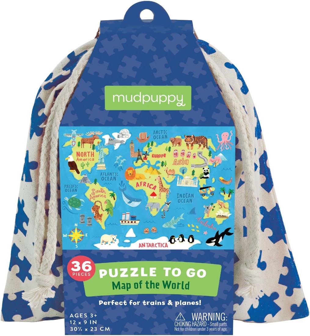 Amazon Com Mudpuppy Map Of The World Puzzle To Go 36 Pieces 12 X9 Kids Ages 3 Colorful Map With Illustrations Of Iconic Landmarks Packaged In Travel Friendly Drawstring Fabric Pouch Perfect