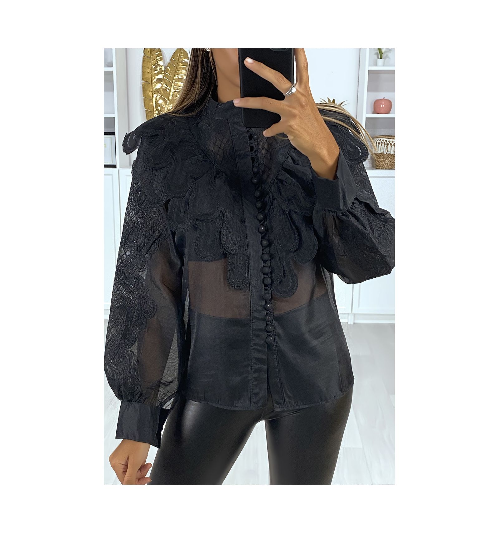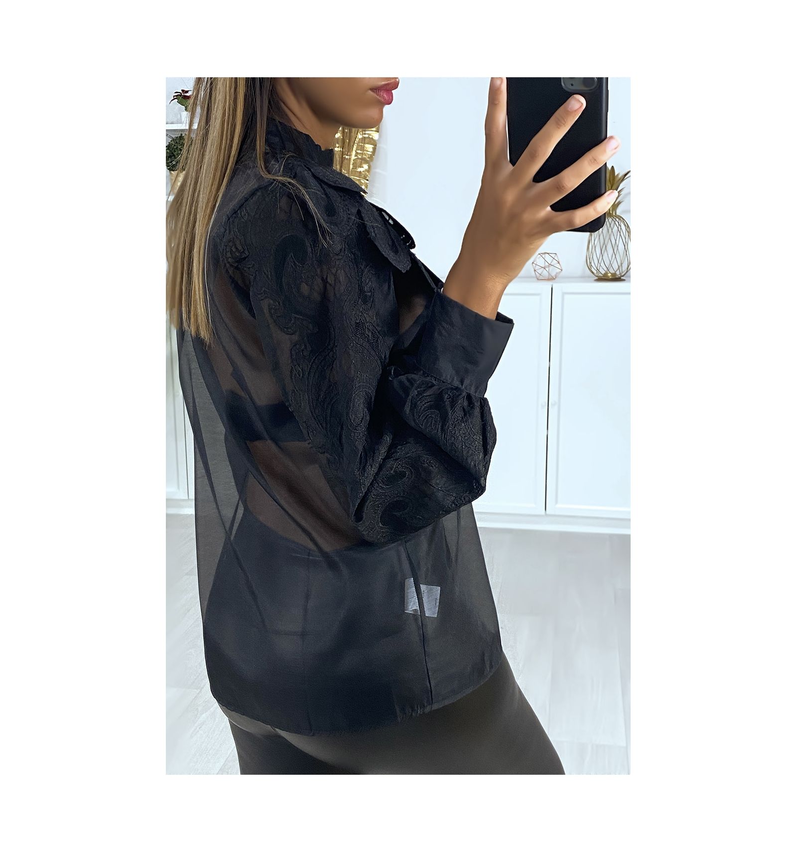Chemise En Voile Noire Avec Col Et Manches Fantaisies