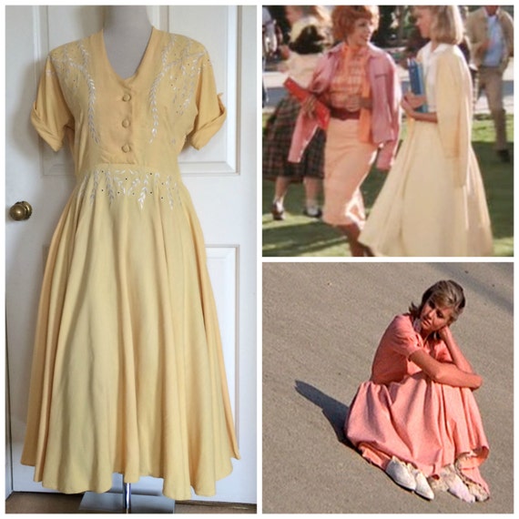 The Clothes Sandy Wore On The First Day Of School Yellow Skirt White Blouse Cardigan Grease Outfits Pink Ladies Grease Costumes