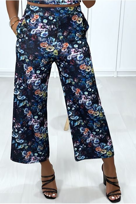 Pantacourt Motif Fleuris Noir Palazzo Avec Poches Pantacourt Femme
