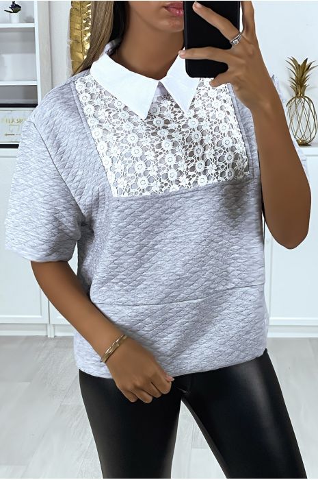 Blouse Grise Matelasse Pour Femme Avec Dentelle Au Buste Et Col Chemise