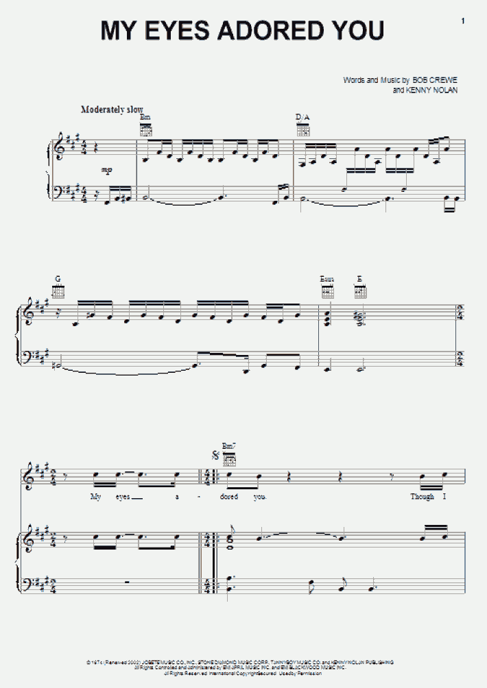Browse our 4 arrangements of "My Eyes Adored You" Sheet music is available for Piano, Voice, Guitar and 2 others with 4 scorings and 2 notations in 4 genres Find your perfect arrangement and access a variety of transpositions so you can print and play instantly, anywhere Lyrics begin "My eyes adored you. My eyes adored you though I never laid a hand on you My eyes adored you like a million miles away from me You couldn't see how I adored you So close, so close and yet so far See All Lyrics Song Credits Writer Bob Crewe Writer Kenny Nolan Producer Bob Crewe Vocals Frankie Valli. Chorus Am D My eyes adored you, though I never laid a hand on you G My eyes adored you Like a million miles away from me you could not see how I Am adored you D C So close, so close and yet so.