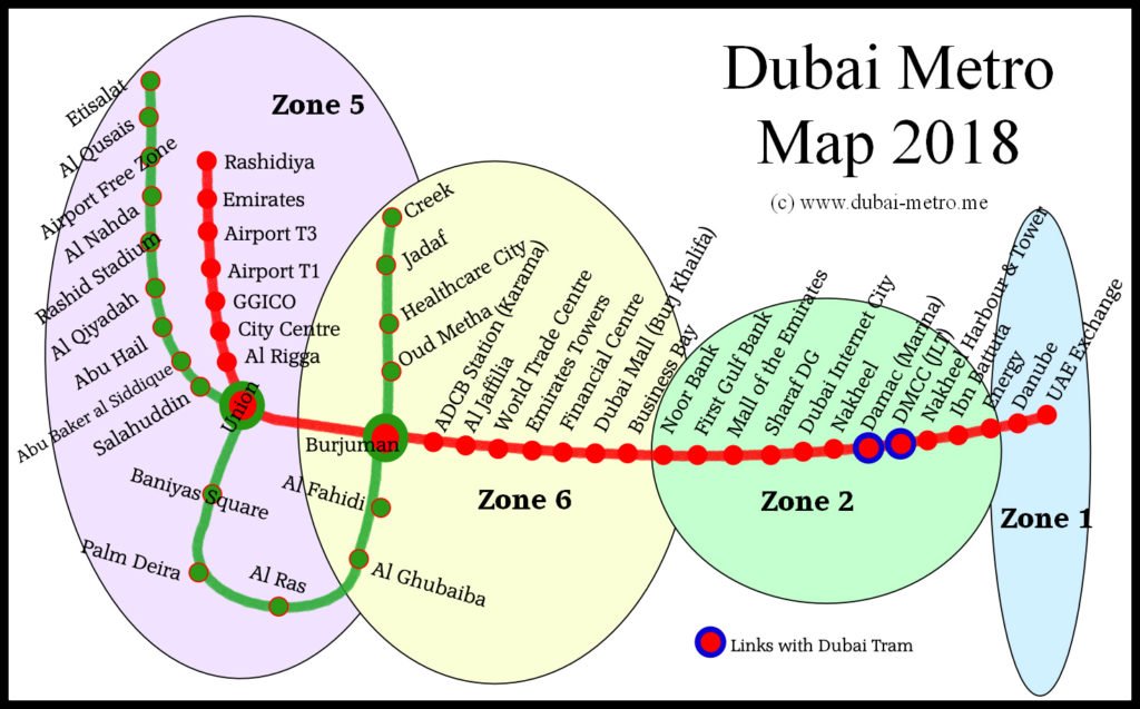 The Dubai Tram route means that the trams themselves can travel in a complete loop from the Al Sufouh depot and back again As you can see from the Dubai Tram map, you can interchange with the Dubai Metro at Dubai Marina and Jumeirah Lakes Towers and also with the Palm Monorail at Palm Jumeirah station. At the time of writing, the number of zones that Dubai is split into is 7 but 3 of these are outside the Dubai Metro area Zones 3, 4 and 7 contain other areas of public transport, including buses Zones 1, 2, 5 and 6 are zones that contain Dubai Metro stations. Dubai Metro Map Red & Green Line Stations Zones Tickets NOL, Route Maps, Ticket Price, Nol Fare Card Cost, Metro Routes, Tickets Outlet for Nol Electronic Fare Cards, purchase Silver, Blue, Gold, Red Metro Passenger Tickets at public bus stations, marine transport stations and RTA service centresDubai City Info, UAE.