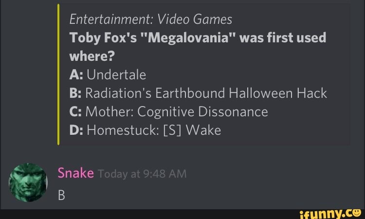 Entertainment Video Games Toby Fox S Megalovania Was First Used Where A Undertale B Radiation S Earthbound Halloween Hack C Mother Cognitive Dissonance D Homestuck S Wake Ifunny