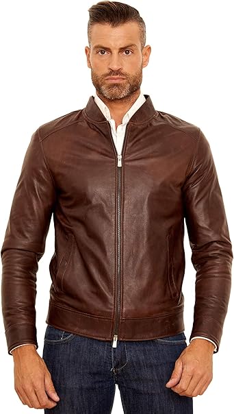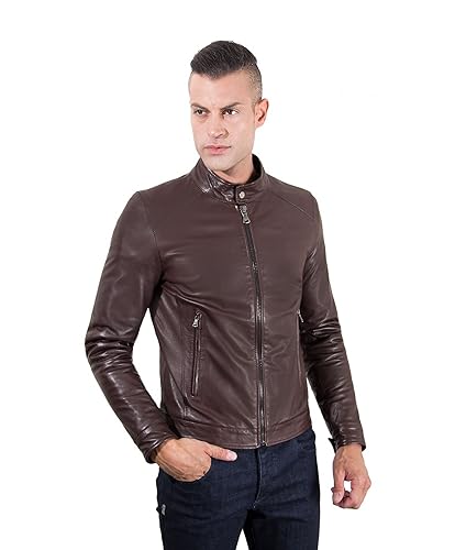 D Arienzo Veste Cuir Marron Fonce Homme Agneau Veritable Blouson Moto Biker Motard Col Rond Veritable Cuir Made In Italy Marlon Amazon Fr Vetements Et Accessoires