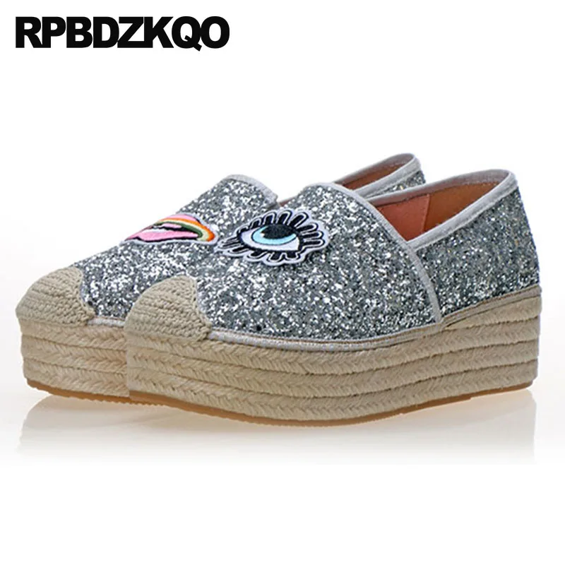 Espadrilles En Or Pour Femmes Paillettes Brodees Semelle Epaisse Mules De Grande Taille Pantoufles De Cils En Chanvre Compensees Aliexpress