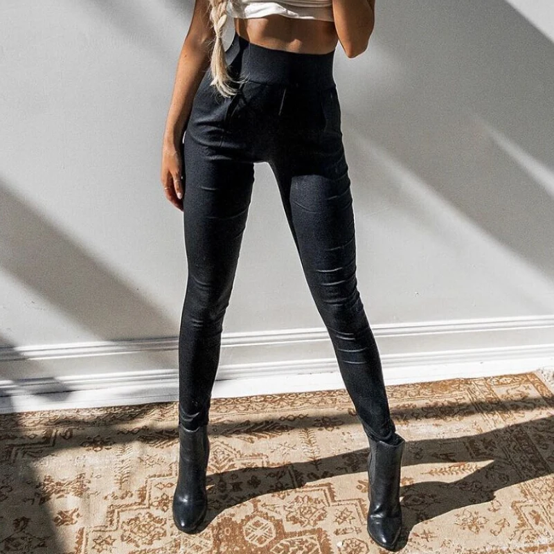 Pantalon Slim En Simili Cuir Pour Femme Taille Haute Vintage