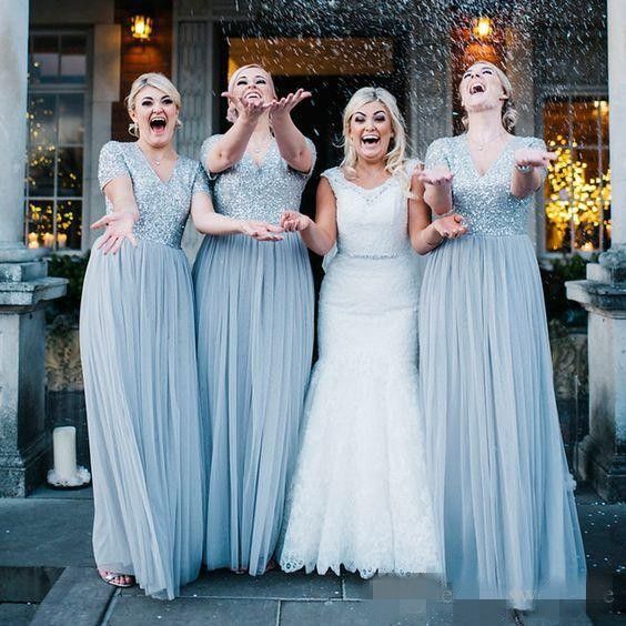Acheter Robes De Demoiselle Dhonneur Bleu Clair Manches Courtes Paillettes Col En V Longueur De Plancher Etage Tulle Fait Sur Mesure Plus La Taille Formelle Mariage Robes De Soiree De 100 95