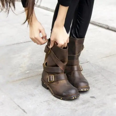 Vintage En Cuir De Vache Femmes Cheville Bottes Noir Brun Bout Rond Epais Talon Plat Bottines Rivets Botas Militares Moto Boot Aliexpress