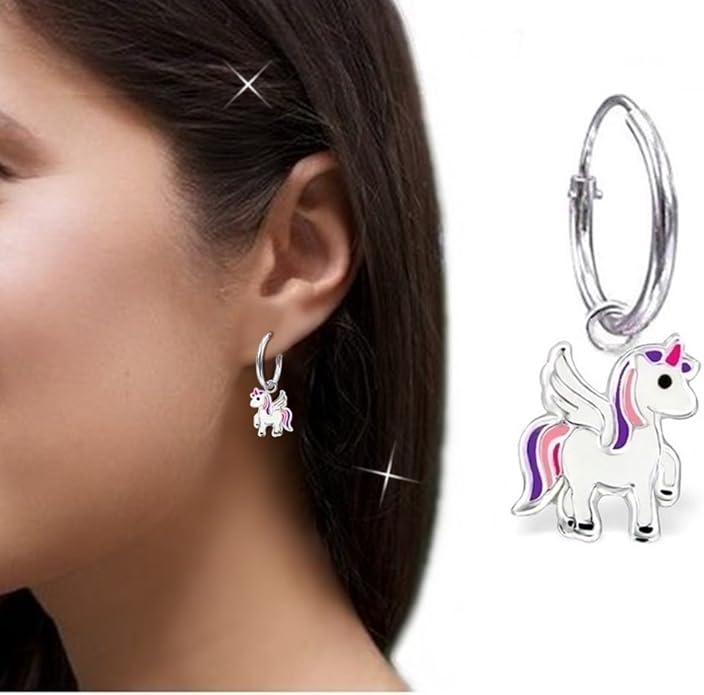 Gh1a Boucles D Oreilles Creoles Avec Licorne Ailee En Argent 925 Pour Petites Filles