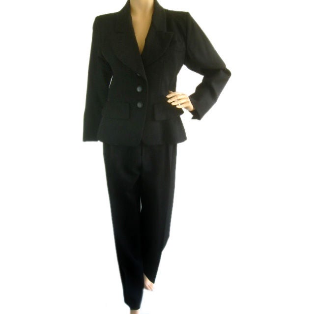 Tamsin Blanchard goes behind the scenes in Paris. This 70's version of the iconic Yves Saint Laurent "Le Smoking" suit is composed of a polka dot shirt and a fine high waist black wool capri pants with tuxedo trimming down the sides Category 1970s Trouser Pant Suits. Yves Saint Laurent became famous for such clothing like trenchcoat, safari suit, and, in 1966, Le Smoking It is an evening female suit, though with present features of masculinity Observing this set, it becomes obvious that the designer always challenged the conventions of the fashion industry protesting to clichés and norms.