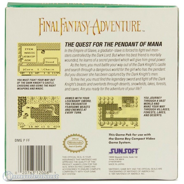 The Final Fantasy Legend, known in Japan as Makai Toushi Sa·Ga, is a video game released for the Game Boy in December 19 by Square Co It is the first game in the SaGa series and the first roleplaying video game for the system Square translated the game into English for worldwide release and renamed it, linking it with the Final Fantasy series to improve marketing Sunsoft rereleased it in North America during 1998;. Final Fantasy Adventure is an Action Role Playing game released for the GameBoy in 1991 It was rereleased in North America by Sunsoft in 1998 It has had 3 remakes The first was the 03 Game Boy Advance game Sword of Mana, which expanded,and modified the plot and gameplay of the original bringing in gameplay mechanics from other games in the Mana series and removing gameplay aspects that. Final Fantasy V is a fantasy roleplaying video game developed and published by Square in 1992 It is the fifth main installment of the Final Fantasy series The game first appeared only in Japan on Nintendo's Super Famicom (known internationally as the Super Nintendo Entertainment System) It has been ported with minor differences to Sony's PlayStation and Nintendo's Game Boy Advance.