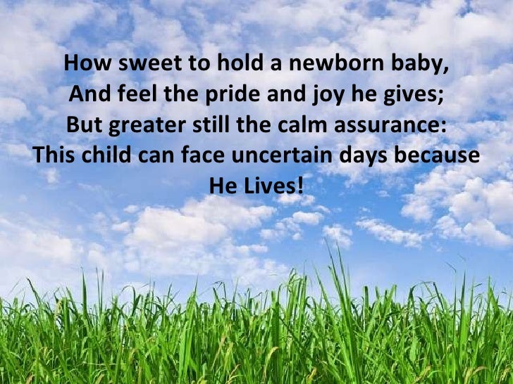 Because He Lives Gaither Vocal Band From the album Gaither Vocal Band Reunited Start Station Start Station Play Song Play Song Share Share Lyrics How sweet to hold a newborn baby And feel the pride and the joy that he gives Oh but greater still, the calm assurance We can face uncertain days because He lives. Display Title Because He Lives First Line God sent His Son, they called Him Jesus Tune Title RESURRECTION Author Gloria Gaither, b 1942;. Because He lives hope shines ever bright Because He lives I will seek His righteousness Because He lives I’ll follow where He leads Because He lives I shall conquer even death And I shall live because He lives!.