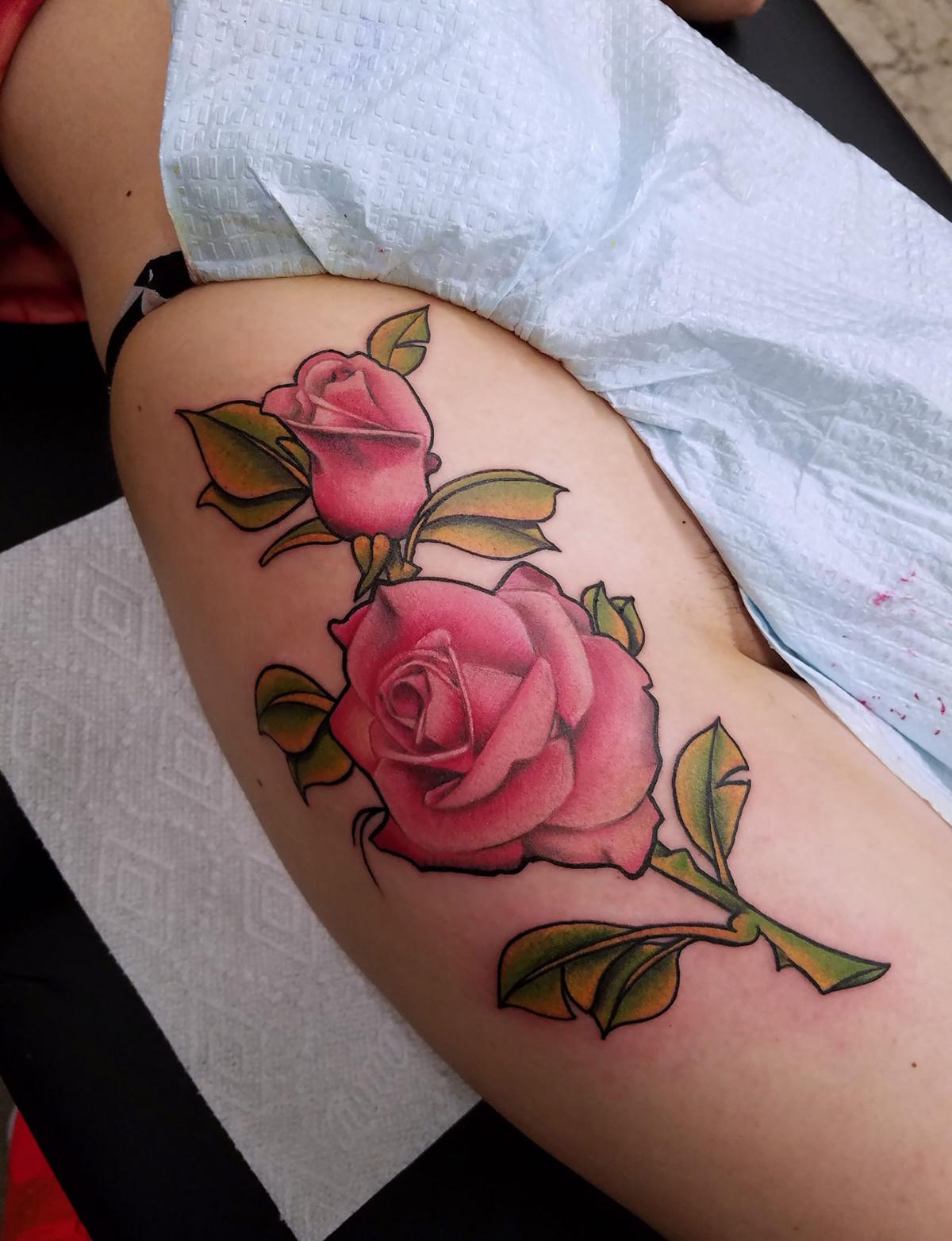 Tatouage De Gros Rose En Couleur Rouge Sur La Haut Cuisse D Un Homme Tatouage Rose Tatouage Rose Rouge Dessins De Tatouage De La Cuisse
