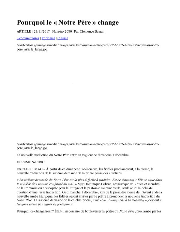 Dans le cadre de la traduction intégrale de la Bible en vue de la liturgie, confiée depuis 1996 à un groupe de biblistes et d’écrivains francophones, le texte du « Notre Père » a fait l. Le «Notre Père» est la prière que Jésus a enseignée à ses disciples C'est la prière fondamentale pour les chrétiens catholiques, orthodoxes et protestants À partir du 1er dimanche de l’Avent (3 décembre 17), la nouvelle traduction du «Notre Père» remplacera de manière officielle l’ancienne formulation datant de 1966 C’est ce qu’ont décidé les Évêques de France. 7 févr 16 Cette épingle a été découverte par Gabrielle Découvrez vos propres épingles sur et enregistrezles.