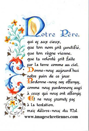 Notre Père, qui es aux cieux, que ton nom soit sanctifié, que ton règne vienne, que ta volonté soit faite sur la terre comme au ciel Donnenous aujourd’hui notre pain de ce jour Pardonnenous nos offenses comme nous pardonnons aussi à ceux qui nous ont offensés Et ne nous laisse pas entrer en tentation mais délivrenous du Mal.