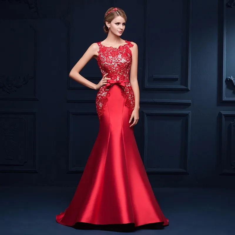 Rouge Dentelle Sirene Robe De Soiree Longue Sans Manches En Dentelle Up Retour Etage Longueur Satin Formelle De Bal Robes Robe De Soiree Sirene Aliexpress