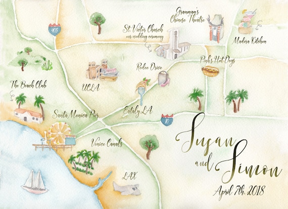 Custom Wedding Map Watercolor Wedding Map Los Angeles Etsy
