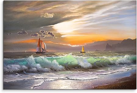 Toile Sur Chassis 1 X 80 Cm Peinture A L Huile D Un Panorama Marin Avec Vagues Voilier Et Ciel Vesperal Rouge Amazon Fr Cuisine Maison