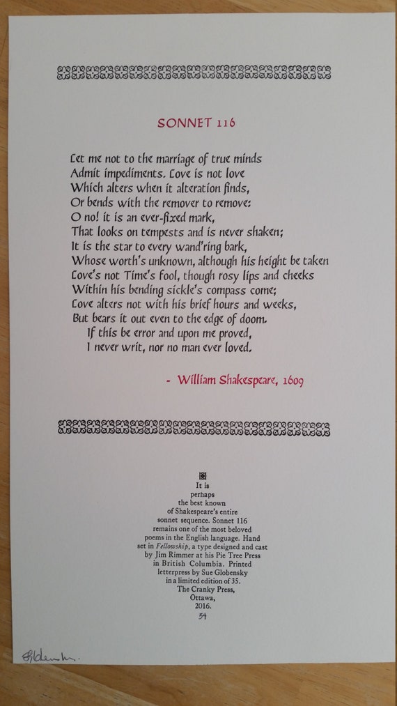 The structure of ‘ Sonnet 116’ is composed to formulate Shakespeare’s quixotic concept of love Throughout the three quatrains and couplet, the poet changes how he describes love;. “Sonnet 116” by William Shakespeare Let me not to the marriage of true minds Admit impediments Love is not love Which alters when it alteration finds, Or bends with the remover to remove O no!. Well you're in luck, because here they come There are 67 shakespeare sonnet 116 for sale on Etsy, and they cost $3243 on average The most common shakespeare sonnet 116 material is paper The most popular color?.