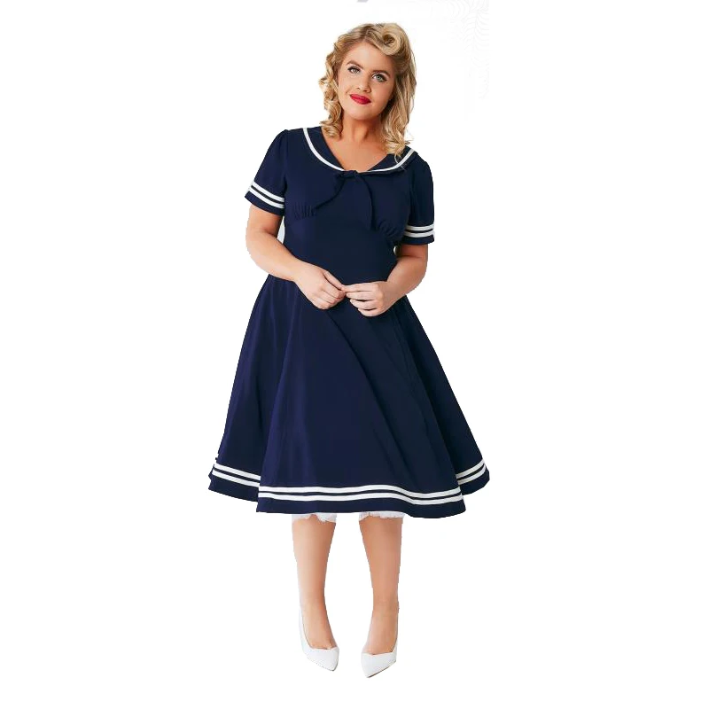 Passepoil Blanc Bleu Marine Robe Grande Taille Pour Femmes Ete A Manches Courtes Taille Haute Surdimensionne Robe Midi Dames Marine Col Robes Aliexpress