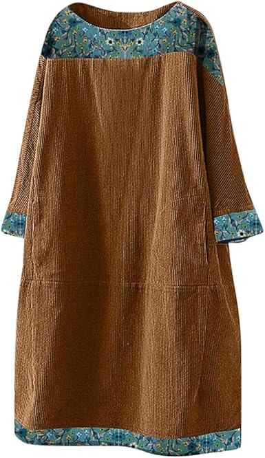 Hulky Robes Femmes Hiver Mi Longues Grande Taille Longue Automne Robes Decontractees A Manches Longues Pour Femmes Robe Plissee En Velours Cotele Robe Trapeze Couleur Unie A Col Rond Avec Poches Amazon Fr