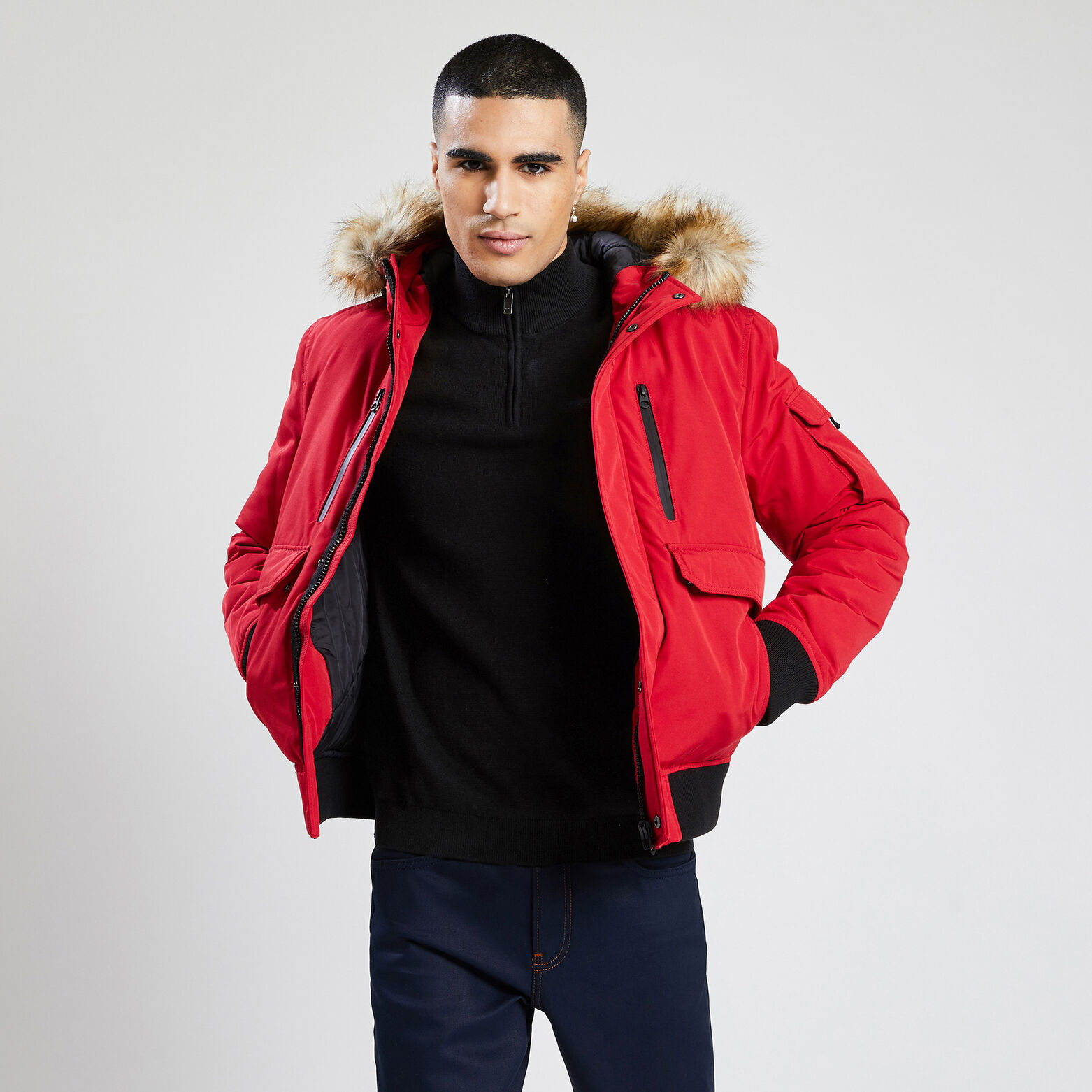 Capuche enveloppante Fermeture zippée sous patte à l’avant Une poche forfait à la poitrine.