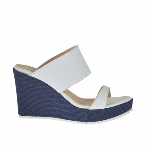 Mule Pour Femmes En Cuir Blanc Et Tissu Bleu Avec Plateforme Et Talon Compense 8