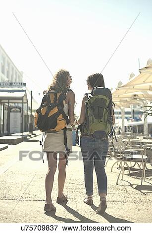 Vue Posterieure De Marche Femme Long Rue Porter Sacs Dos Banque De Photo U Fotosearch