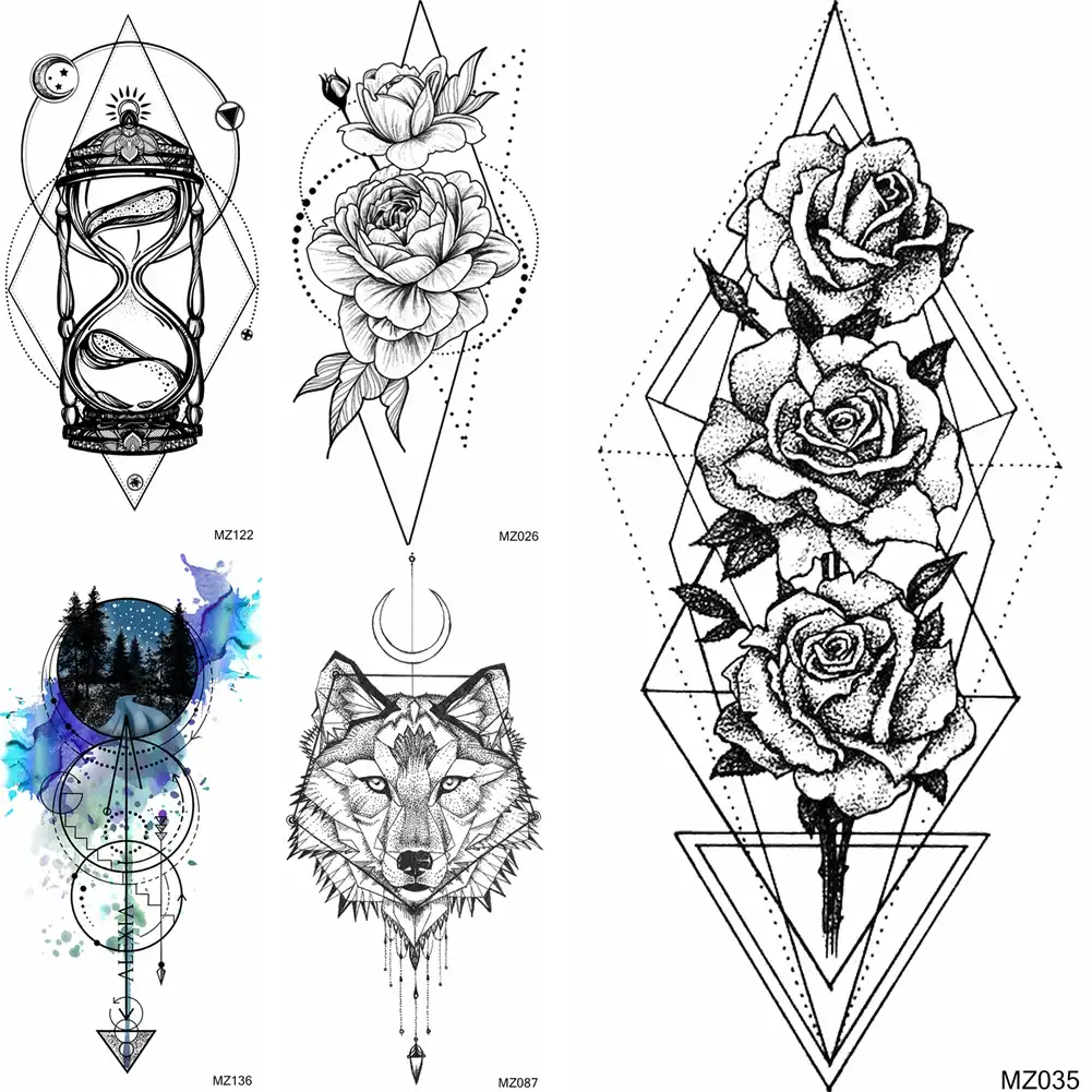 Minimaliste Rose Fleur Geometrique Renard Loup Faux Tatouages Temporaires Couleur De L Eau Tatouage Autocollants Femmes Sablier Sablier Tatoos Aliexpress
