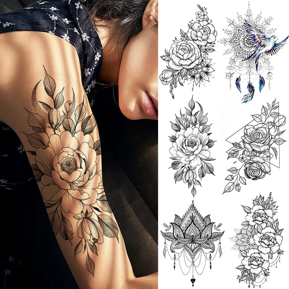 Mode Mandala Fleur Temporaire Tatouages Autocollant Geometrique Rose Loup Lion Tatouages Autocollant Pour Adulte Corps Art Bras Wasit Tatouages Aliexpress