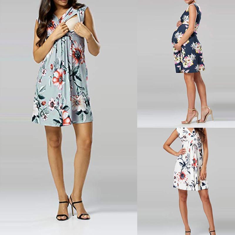 Femmes De Maternite D Ete Sans Manches Imprime Floral Robe Casual Robe De Grossesse Blanc Rakuten
