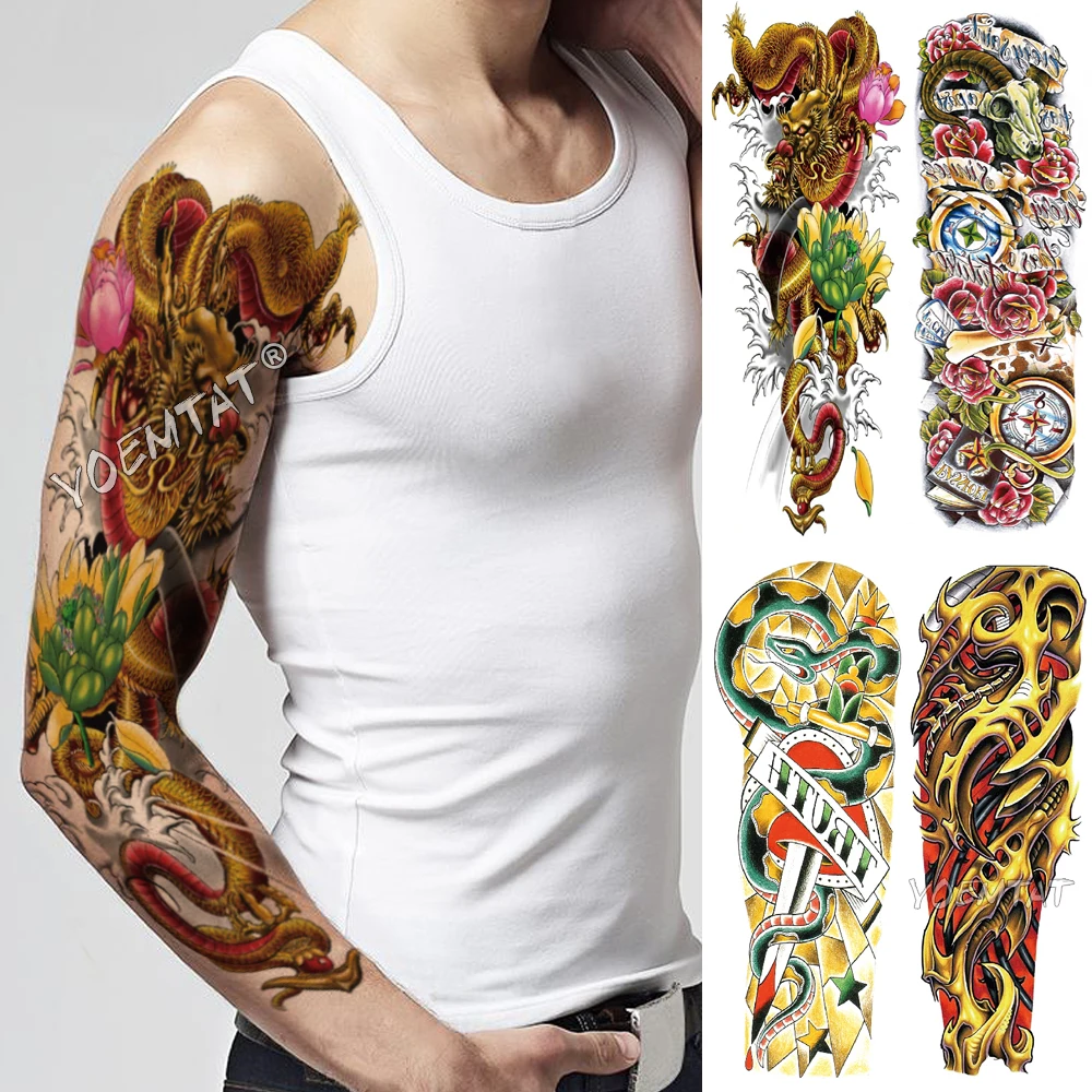Large Arm Sleeve Tattoo Golden Dragon Lotus Waterproof Temporary Tatoo Sticker Japanese Wave Animal Men Women Full Totem Tatto Temporary Tattoos Aliexpress