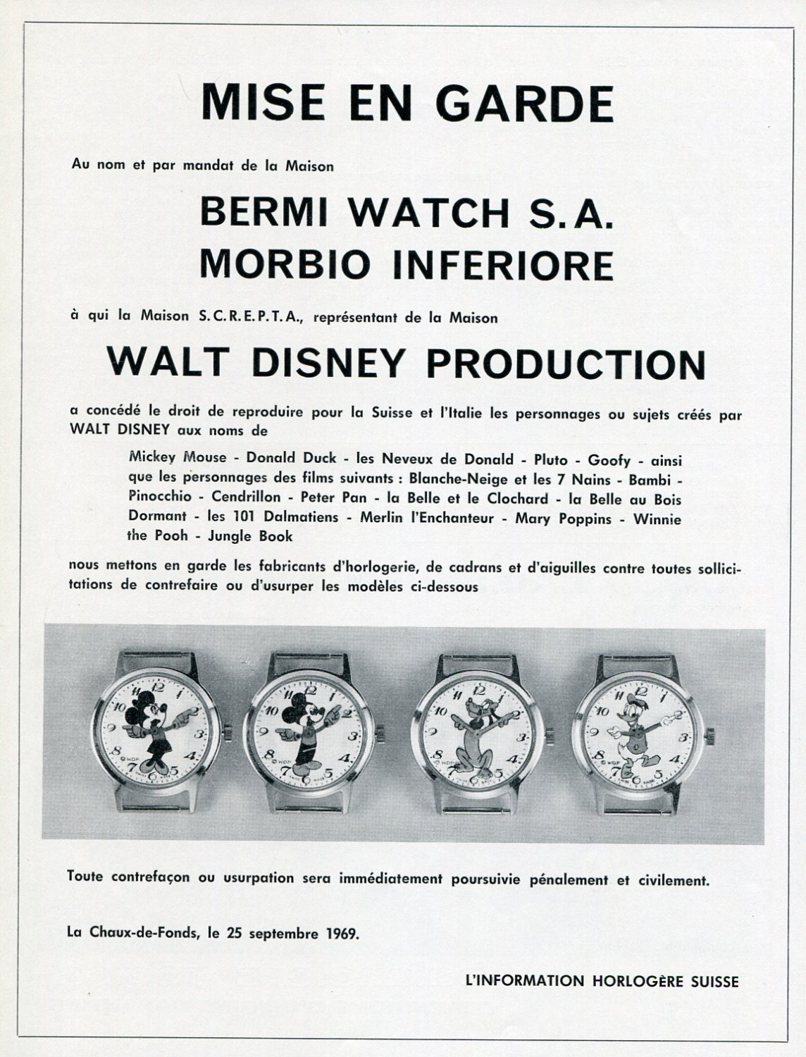 1969 Advertisement Walt Disney Production Bermi Watch Co Screpta Swiss Print Ad Publicite Suisse