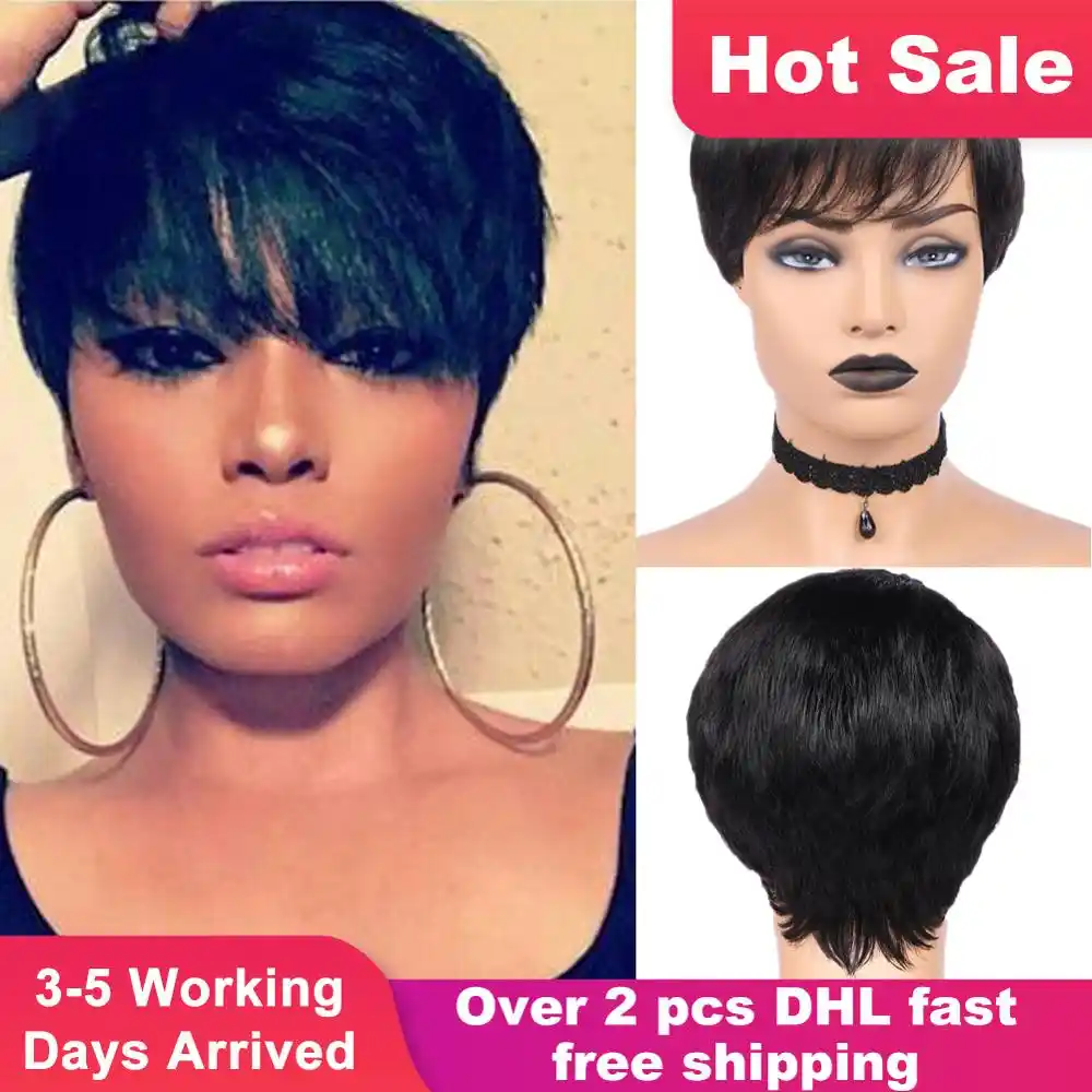 Queentas Pixie Cut Court Perruques De Cheveux Humains Avec Une Partie Gratuite Cote Frange Pour Les Femmes Noires Noir Naturel 1b Amazon Fr Beaute Et Parfum