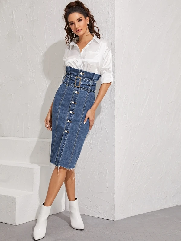 Jupe Crayon En Jean Ceinturee Avec Taille Froncee Ett Ourlet Effiloche Shein