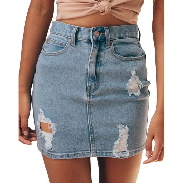 Junkai Jupe Moulante A Taille Haute Femme Jupe Courte En Denim Dechiree Bleu Clair L Amazon Fr Vetements Et Accessoires