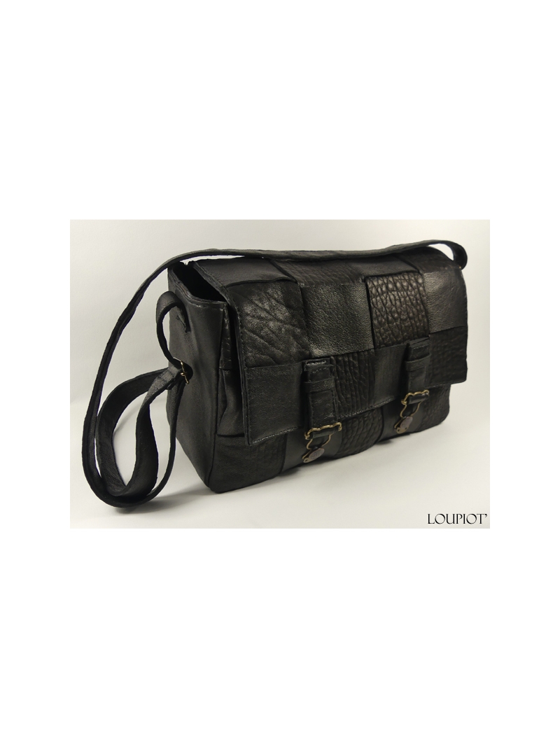 Sac Bandouliere Style Cartable En Cuir Noir Cuir Lisse Et Cuir Bulle Noir