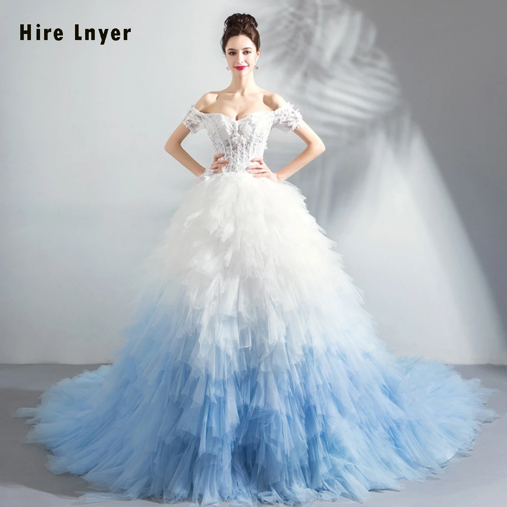 Robe De Mariee Princesse De Luxe Off The Shoulder Short Sleeve White Blue Splice Skirt Princess Ball Gown Wedding Dresses China Wedding Dresses Aliexpress