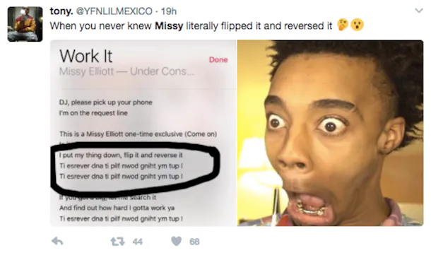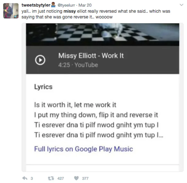 Missy Elliott Work It 426 Youtube Lyrics Is It Worth It Let Me Work It L Put My Thing Down Flip It And Reverse It Ti Esrever Dna Ti Pilf Nwod Gniht