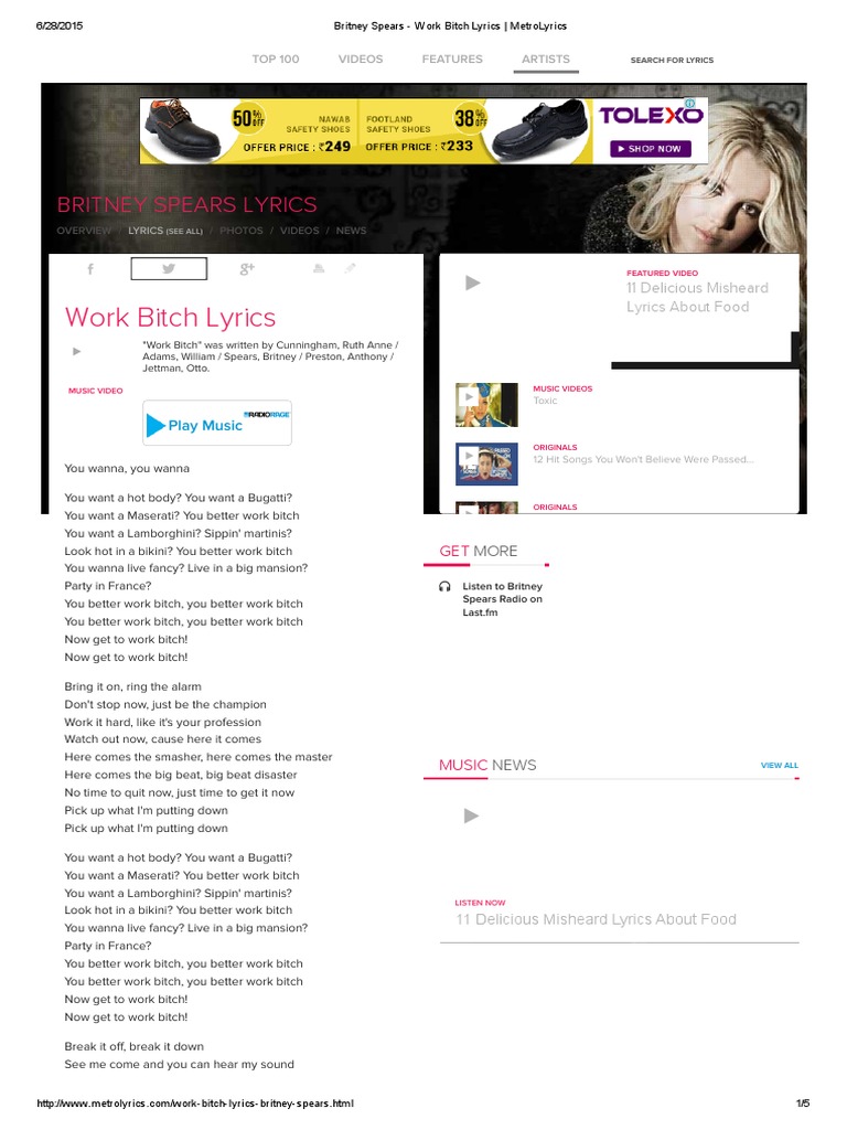 Britney Spears Work Bitch Lyrics Metrolyrics Entertainment General Leisure