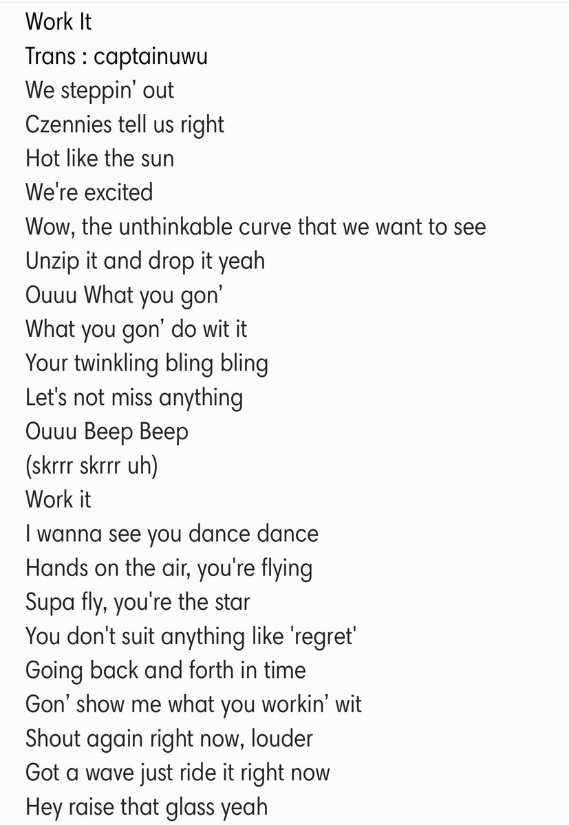 Work It Lyrics in English by NCT U is a latest Korean song from the album 'NCT Resonance Pt2' sung & performed by Korean boy band 'NCT U' and the song lyrics written by Kenzie Work It Lyrics We steppin' out, Czennies tell us right Hot like the sun, we are a little excited. Let me work it I put my thing down, flip it and reverse it Ti esrever dna ti pilf, nwod gniht ym tup Ti esrever dna ti pilf, nwod gniht ym tup If you got a big elephant trumpet, let me search you And find out how hard I gotta work you. Missy Elliott Work It Official Music Video ICONOLOGY out now https//missyelliottlnkto/ICONOLOGY#THROWITBACKCheck out the Missy Elliott Official Music.