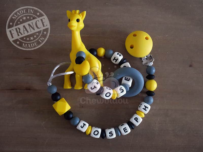 Hochet De Dentition Personnalise Gris Et Jaune Pale De Creas