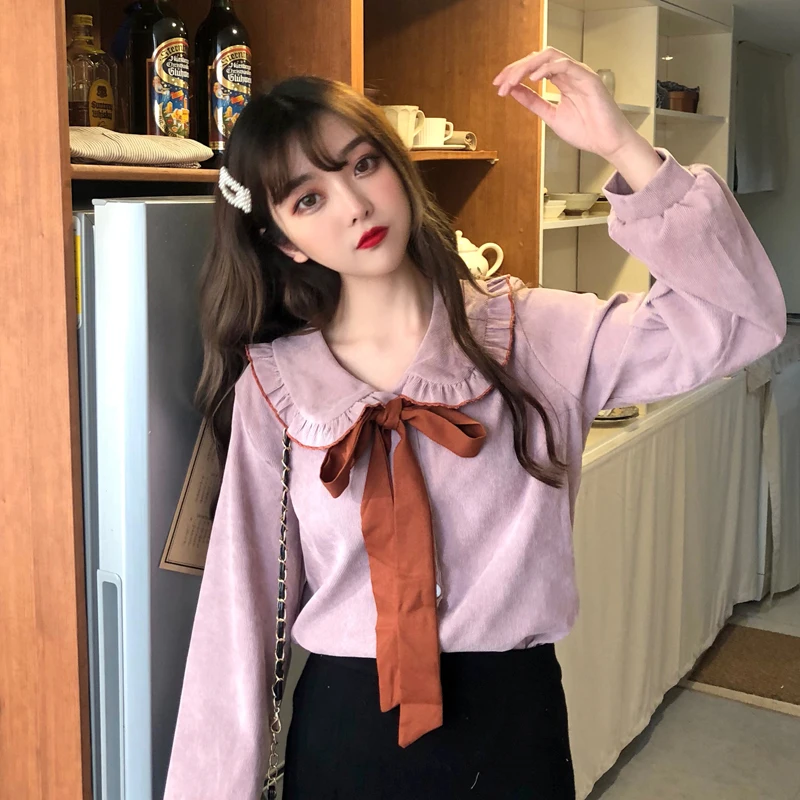 Ruffle Blouse Bow Long Sleeve Kawaii Shirt White Korean Vintage Office Automne 19 Mode Femme Fall Tops Pink Womens And Blouses Blouses Shirts Aliexpress