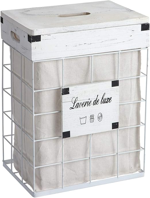 Panier A Linge Corbeille En Metal Et Bois Blanc Style Industriel Avec Panier En Tissu Amovible Amazon Fr Cuisine Maison
