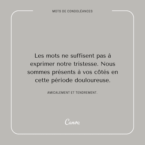 Profitez de la sélection faite par Canva pour confectionner un petit message de condoléances à la famille du défunt Imprimezle ou partagezle directement via vos réseaux sociaux Dans l’ombre de la vie, votre petit mot ravivera les plus beaux moments vécus ensemble. D'usage on exprime sa sympathie par écrit et à la main sur un support adapté en utilisant une encre sobre comme le noir ou le bleu Nous vous conseillons de rédiger un message assez court, authentique et n'hésitez pas à évoquer vos souvenirs heureux partagés avec le défunt, ses plus belles qualités, sans oublier de penser à sa. Votre message ne doit pas être long Même une brève note suffira à laisser le survivant ou les survivants savoir que vous pensez à eux Les cartes de sympathie doivent être écrites ou imprimées sur une carte de sympathie, une carte vierge ou une bonne papeterie.